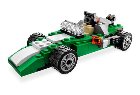 Из деталей этого набора можно построить три различных транспортных средства. Зеленую спортивную машину с открывающимися дверьми. Гоночную машину отчасти напоминающую болид формулы один и стильный хот-род. Инструкции по постройке любой из трех моделей модно найти внутри коробки.