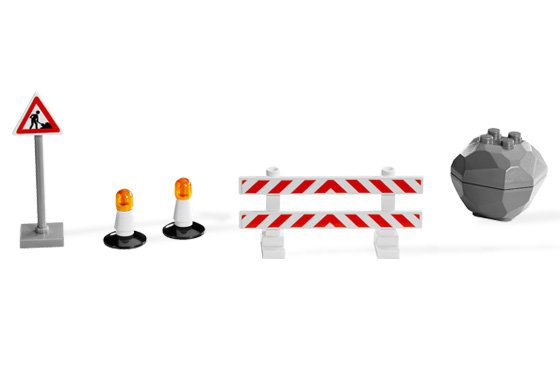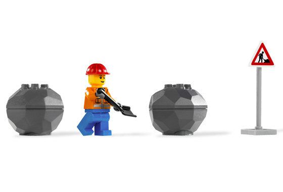 В комплект набора входит фигурка рабочего, лопата, камни дорожное заграждение и предупредительные знаки.