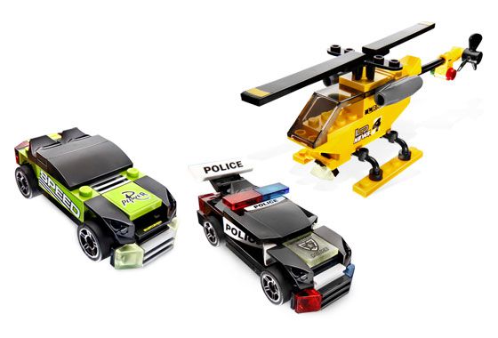 Для компании LEGO уже стало традицией вместе с маленькими наборами, состоящими всего из одного автомобиля, выпускать в серии "Крохотные турбогонщики" коробочные наборы большего размера. Но этом наборе есть не только два автомобиля - зелёный спортивный автомобиль беглеца и не менее быстроходный полицейский патрульный автомобиль, а также ещё и вертолёт службы новостей.
