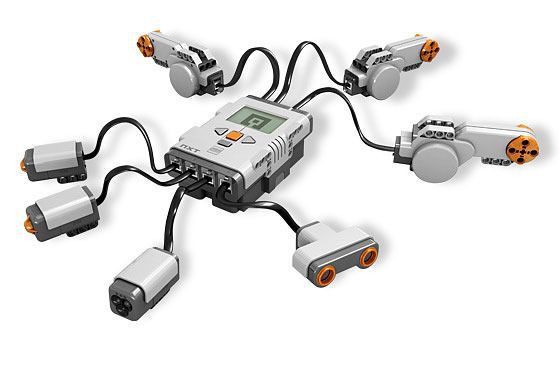 • Элемент NXT c 32 битным микропроцессором и большим дисплеем, поддерживающий соединение по USB и Bluetooth.  4 входа и два выхода, для подключения переферии.