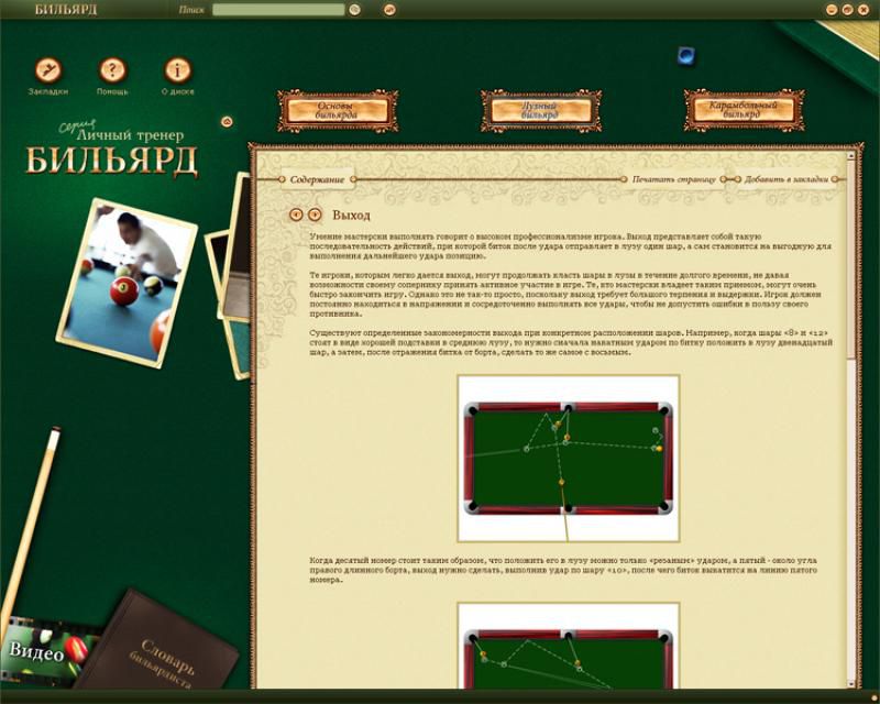 Теперь всем любителям бильярда предоставляется возможность научиться играть или повысить уровень мастерства, а также узнать больше об этой увлекательной игре не выходя из дома! Мультимедийный продукт «Личный тренер. Бильярд» познакомит вас с правилами и техникой выполнения основных ударов, расскажет все о киях, шарах, столах. Вы узнаете, как выглядит стойка бильярдиста, научитесь понимать профессиональный сленг и специфические термины. Очень многие важные моменты в бильярде легко отрабатываются у экрана монитора. Уроки у «личного тренера», которые можно брать в любое удобное для вас время, помогут впоследствии продемонстрировать отличные навыки игры!