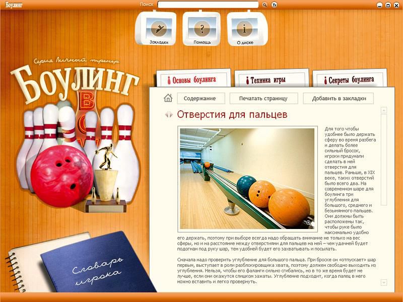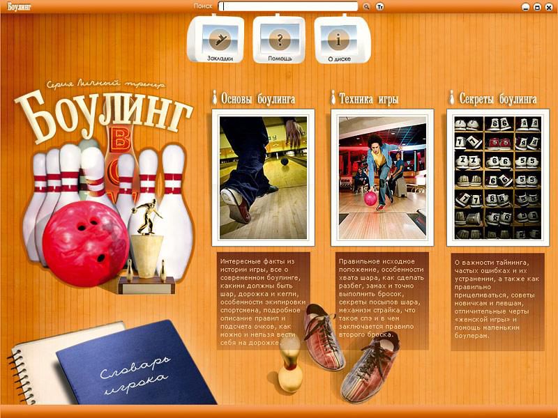Сама суть игры проста, а предсказать траекторию движения шара так сложно! Хотите покорить дорожку? Обращайтесь за помощью к личному тренеру. Мультимедийный продукт "Боулинг" из серии "Личный тренер" предоставляет прекрасную возможность не только проникнуть в тайны этой уникальной игры, узнать все о шарах, дорожках, кеглях, обуви и одежде, ознакомиться с профессиональным сленгом, но и получить подробные практические советы от профи, а также значительно повысить уровень мастерства. А масса удивительных историй поможет вам развлечь друзей после игры.
