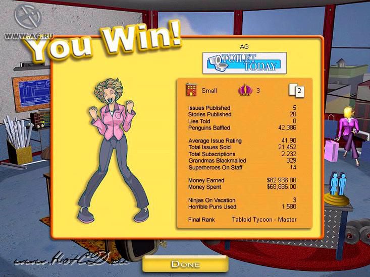 Пришло время копаться в чужом грязном белье! Вы - главный редактор скромной бульварной газеты и конкуренты съедят ее с потрохами, если вы станете печатать скучную правду. Пусть публику шокируют скандальные заголовки - лишь бы от этого повысился тираж! Пусть страницы пестрят сомнительными историйками - адвокаты защитят вас от обвинений в клевете! Забудьте о честной конкуренции и сделайте удивленный вид, когда выяснится, что в редакции конкурента были уничтожены все носители информации... Высоких вам рейтингов!