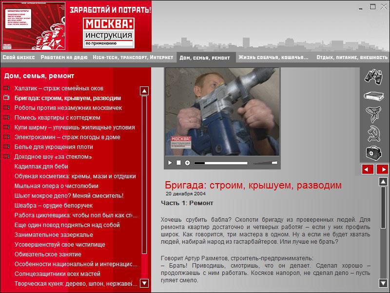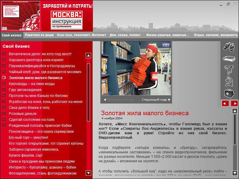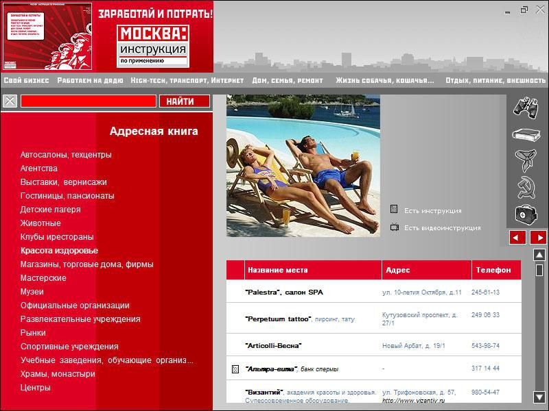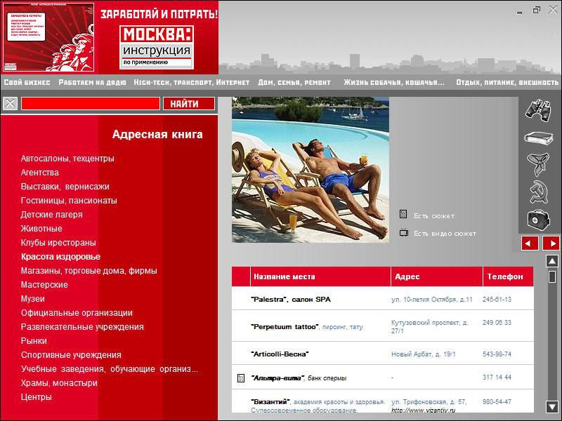 Новая компьютерная программа посвящена такой животрепещущей теме для каждого обитателя Москвы, как деньги. «Заработай и потрать» – «двойная» рубрика. С одной стороны, она включает тысячу и один честный способ заработать: от ремесел до самых рейтинговых профессий. С другой, подскажет, как с умом потратить свои кровные. Тайные места – где можно купить то, чего нигде нет? Как торговаться на рынкее Как купить прикид прямо с подиума? Товары, услуги, образование, опробованные на себе.
