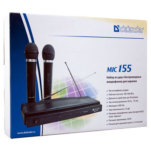 Defender MIC-155 – набор из двух беспроводных микрофонов. Его главное преимущество– возможность петь дуэтом. Большинство современных DVD оснащены только одним микрофонным входом, и данная особенность набора иногда является решающей в выборе.