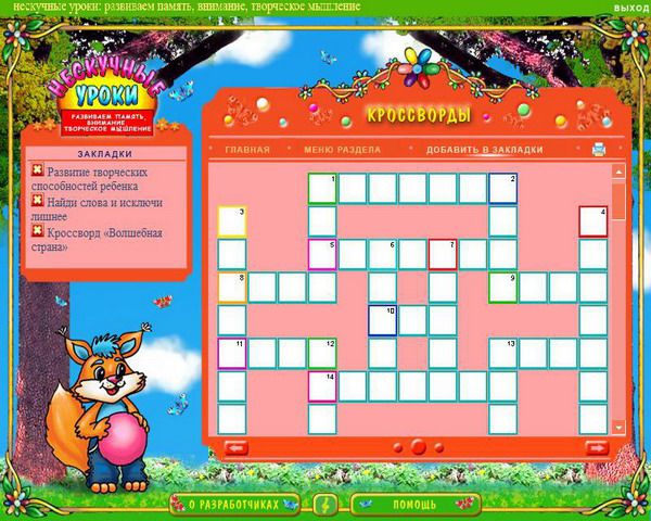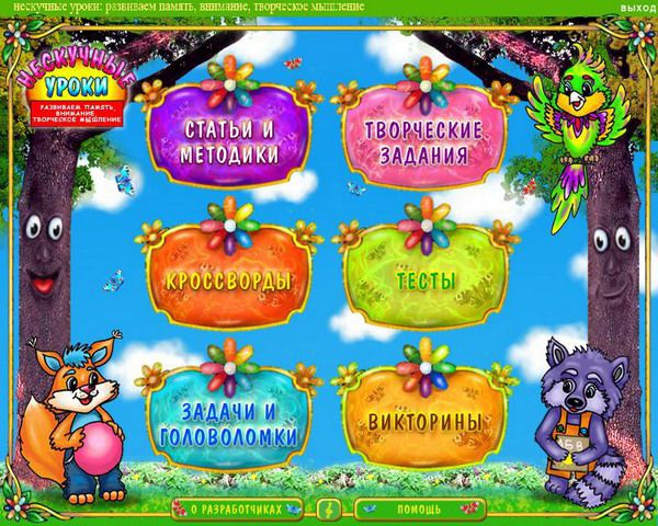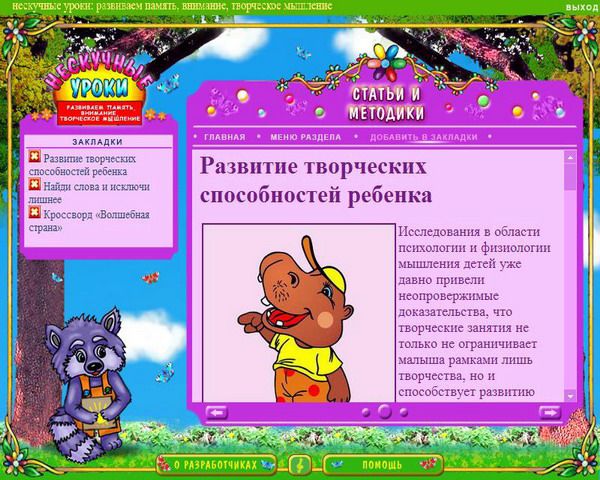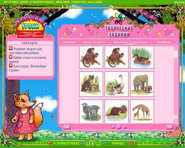 Курс «Нескучные уроки: развиваем память, внимание, творческое мышление» создан специально для юных пользователей и их заботливых родителей. Данный продукт входит в серию «Нескучные уроки», содержащую яркие обучающие программы, которые смогут обеспечить всестороннее развитие детей, помогая им учиться с удовольствием. В данном мультимедийном издании собран ряд увлекательных заданий, которые способствуют развитию творческих способностей, памяти, воображения и внимания ребенка. Яркое и красочное оформление программы и неординарные задания помогут сформировать устойчивый интерес ребенка к упражнениям, и доставит ему массу удовольствия. Помимо этого в издании содержатся статьи для родителей, которые помогут узнать много того, чем можно занять ребёнка в свободное время, чтобы это было интересно и с полезно для него. Программа рекомендована детям от 3 до 12 лет.
