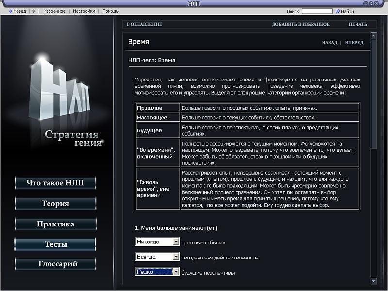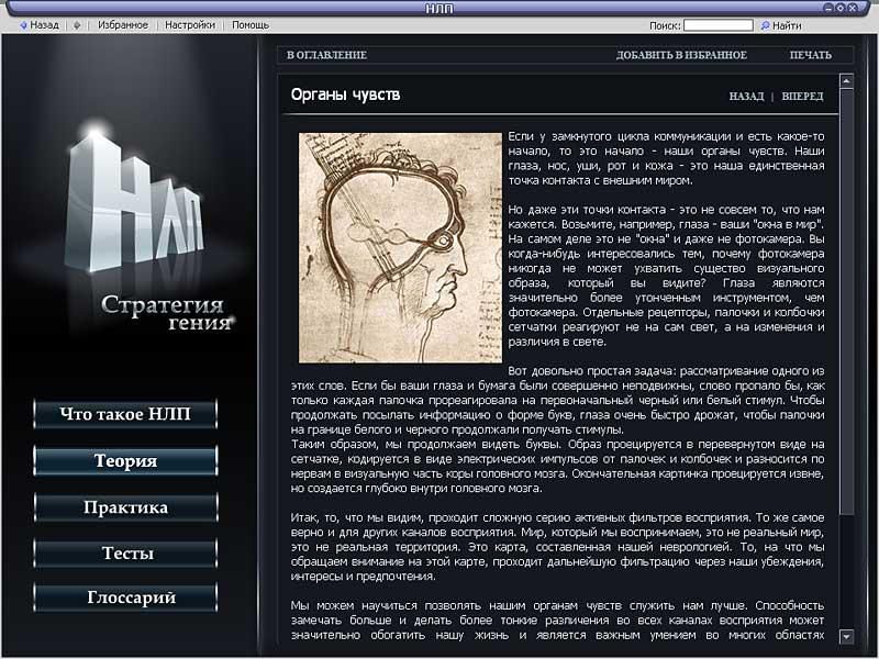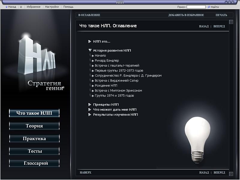 «НЛП. Стратегия гения» – практическое пособие для всех, кто стремится повысить эффективность своей деятельности и достигнуть наивысших результатов. В пяти разделах энциклопедии: «Что такое НЛП?», «Теория», «Практика», «Тесты» и «Глоссарий» – можно найти исчерпывающие сведения о том, что представляет собой НЛП, и закрепить полученные знания с помощью специальных тестов.