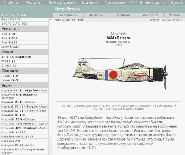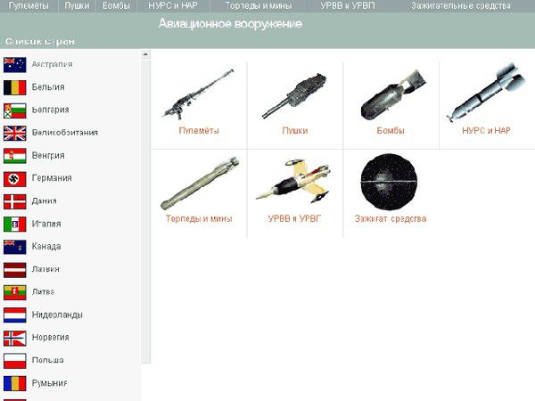 Сведения о различных видах оружия находятся в одноименной рубрике, которая откроет перед любителями авиации любопытные данные о пулеметах, пушках, бомбах, зажигательных средствах, торпедах, минах, управляемых и неуправляемых ракетах.