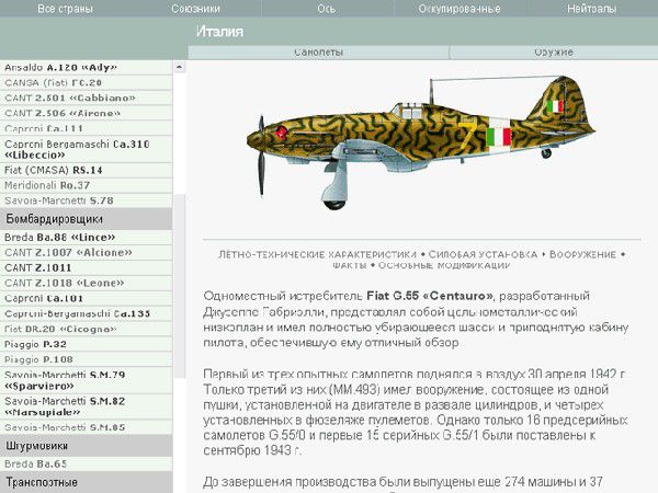 Всего в электронной энциклопедии «Оружие Второй Мировой Войны: Авиация» пять тематических разделов. Самый обширный из них содержит сведения о самолетах. Приведены их летно-технические характеристики, основные модификации, вооружение, информация о странах-производителях и многое другое.