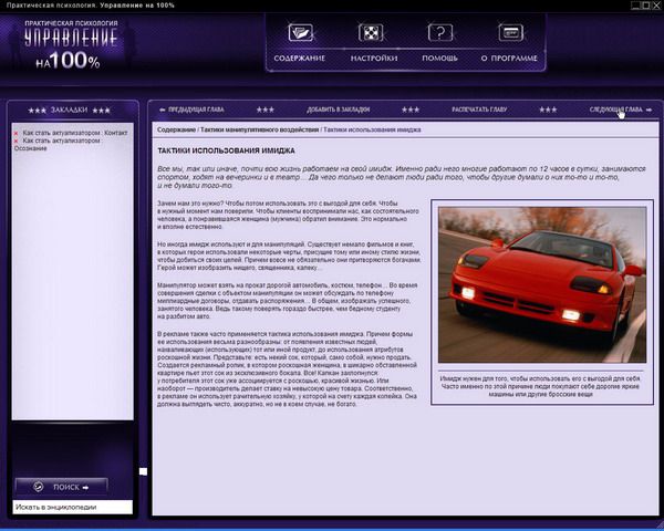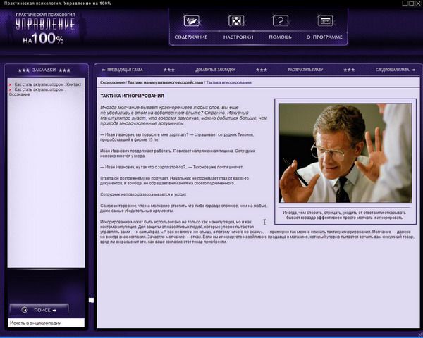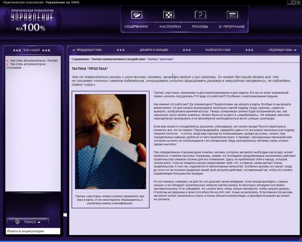 Этот мультимедийный проект создан специально для тех, кто хочет овладеть технологиями управления людьми или научиться противостоять им. Здесь описаны простые эффективные, а главное работающие техники скрытого управления, манипулирования в бизнесе и торговле, волевого давление и т.д. Если вы хотите взять верх над своим соперником, не применяя никакого физического воздействия, сделать карьеру или просто стать более успешным – эта энциклопедия именно то, что вам нужно. Так как она открывает вам новое поистине невероятно мощное оружие, которое бесспорно пригодиться вам, как в личной жизни, так и на работе.