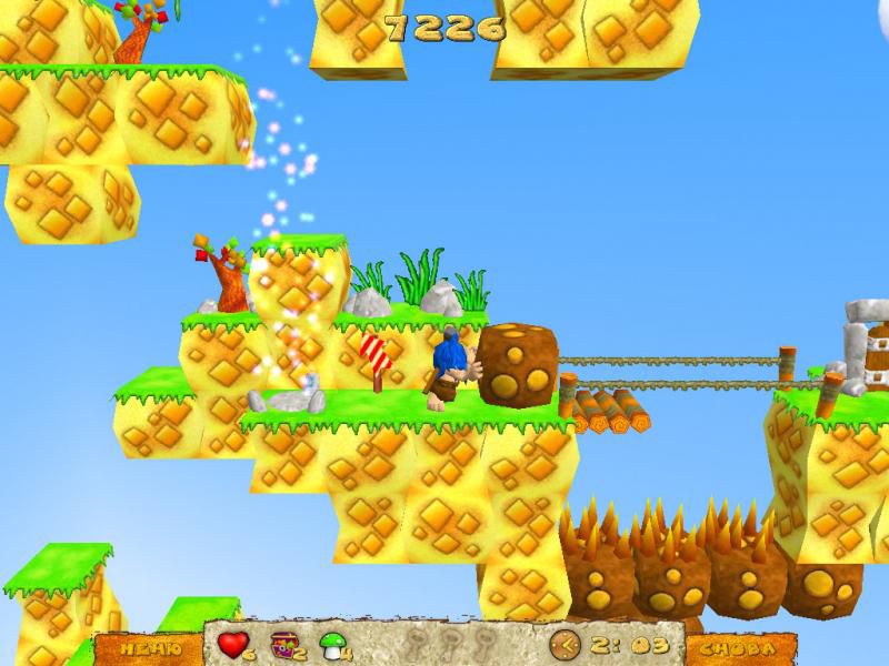 Будьте аккуратны и с разнообразными монстрами - встреча с ними грозит потерей жизни. К счастью, наш веселый герой тоже не лыком шит: на врага он может сбросить булыжник. Против такого весомого аргумента ни один саблезубый хищник возразить уже ничего не сможет.