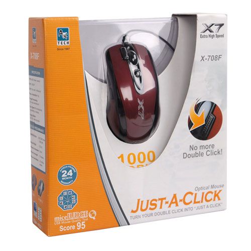 Еще одним плюсом оптической мыши A4Tech Х-708F является уникальная кнопка «Двойной клик», расположенная рядом с колесом прокрутки. Она повышает эффективность в работе и экономит рабочее время. С помощью этой кнопки вы мгновенно откроете файлы и программы с первого клика. Нажав однажды, кликнешь дважды!