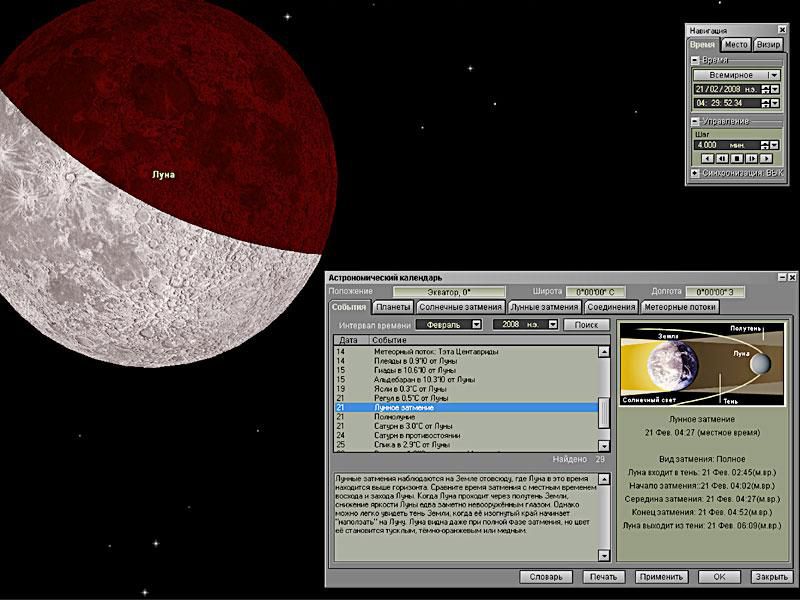 - Расчет и визуализация всех важнейших астрономических событий на протяжении многих тысячелетий в прошлом и будущем