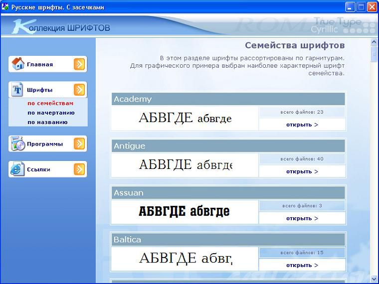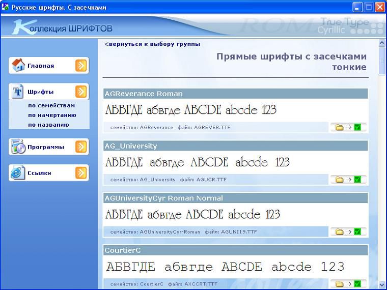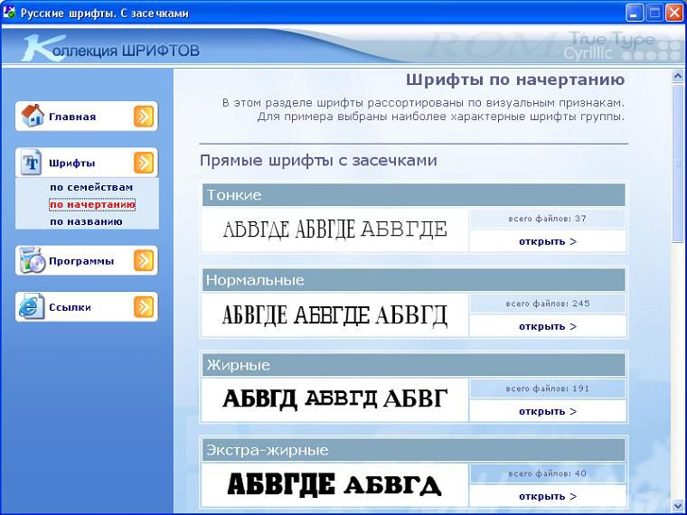 Оболочка коллекции работает без установки, прямо с диска, а каждый шрифт снабжен предварительным просмотром. Доступно три варианта поска: по семейству, по начертанию и по названию шрифта. Теперь можно не перегружать систему лишними файлами, а устанавливать только то, что вам действительно нужно и будет гарантированно работать!