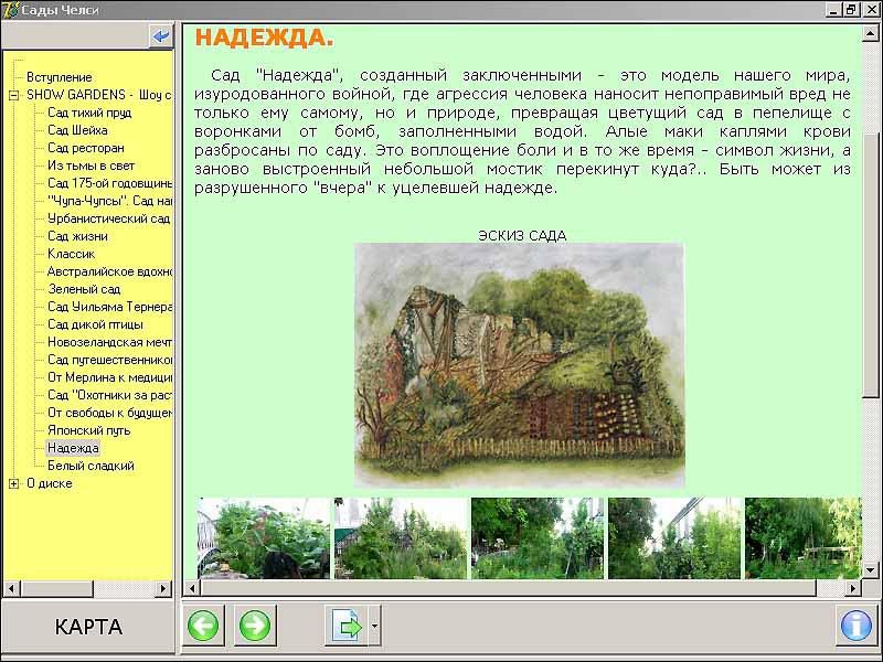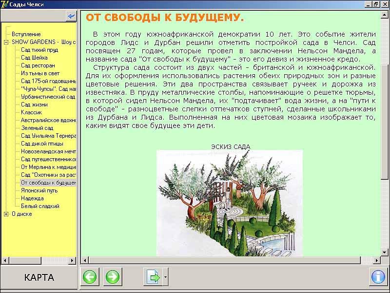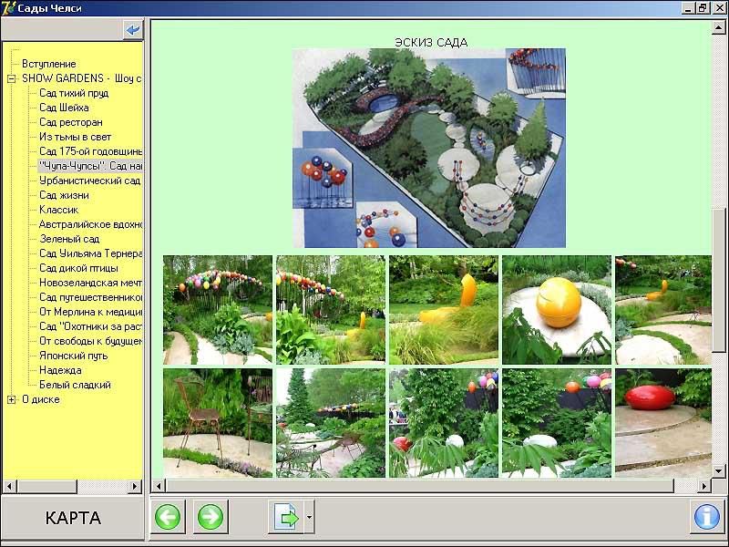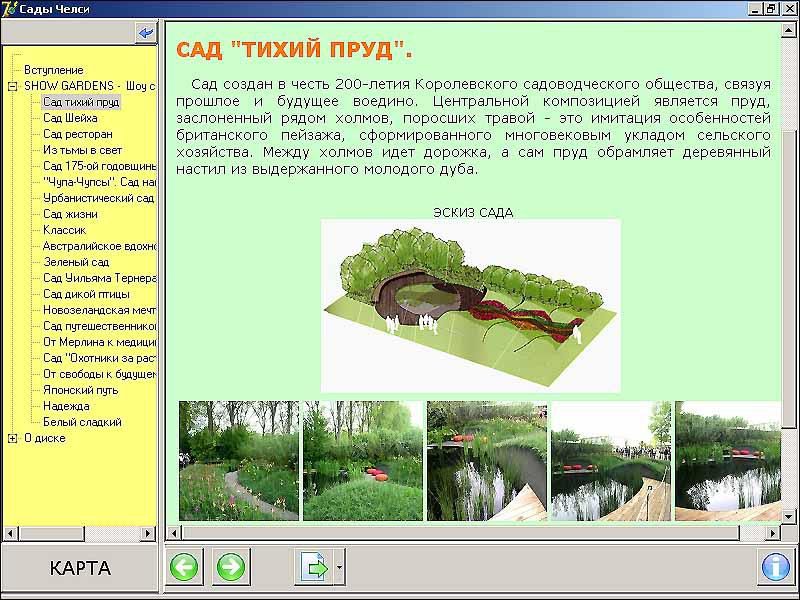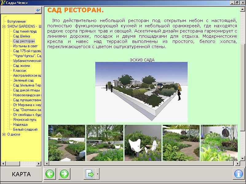 На диске представлено более 300 фотографий, рассказывающих о шоу-садах – самых впечатляющих «экспонатах» знаменитой выставки садового искусства в Челси, на которой были представлены работы дизайнеров со всей планеты, в том числе из Новой Зеландии, Австралии, Японии, России, Южной Африки, Эквадора. Шоу-сады имеют площадь в среднем 100–150 кв. м.