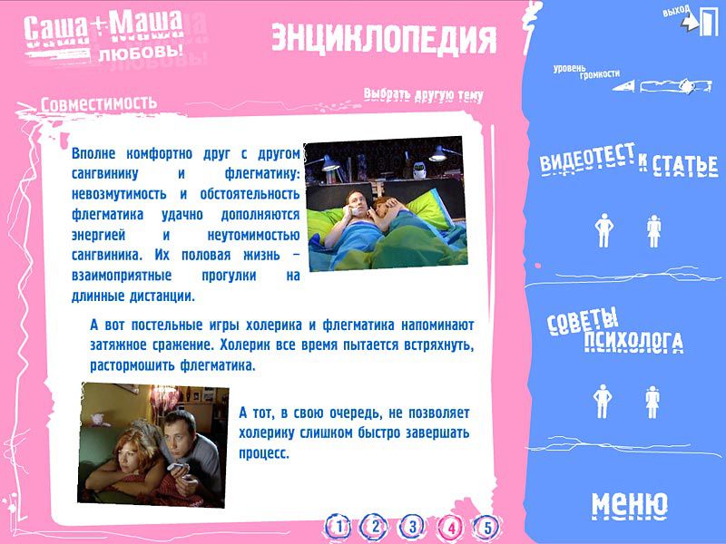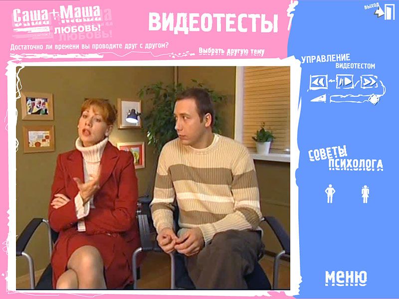 Диск «Саша + Маша. Энциклопедия совместной жизни. Любовь» включает не только лучшие выпуски сериала «Саша + Маша», но и энциклопедическую часть, в которой собраны статьи профессиональных психологов и сексологов о различных аспектах совместной жизни. Кроме того, диск содержит 12 интерактивных видеотестов, составленных специалистами на основе видеороликов из сериала. Вы можете пройти тест в одиночку или с партнером. Причем мужчинам и женщинам будут задаваться разные вопросы. Результаты теста помогут вам понять, подходите ли вы друг другу, оценить вашу психологическую и сексуальную совместимость.
