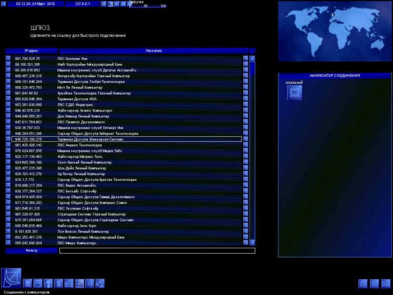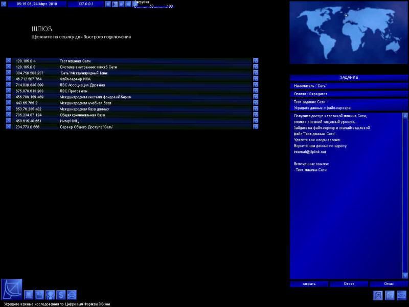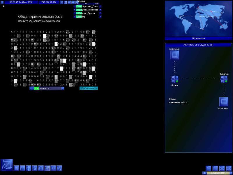 Итак, действие происходит в обозримом будущем - в 2010 году. Вы - "свободный" хакер, продающий свои услуги всем, кто заплатит. За вознаграждение вы готовы на все - проникать в чужие сети, похищать секреты корпораций, обрушивать серверы, уничтожать и подменять информацию, воровать деньги с электронных счетов, править полицейские и прочие досье, подставлять невинных людей, участвовать в создании суперкрутого вируса... В результате вы повышаете свой уровень и зарабатываете деньги, которые, в свою очередь, тратите на апгрейд компьютера и покупку софта. (Хм, вообще-то хакеру покупать софт не пристало - какой он хакер, если не может добыть его бесплатное Но это, очевидно, чтобы жизнь медом не казалась.) Деньги можно также зарабатывать игрой на электронной бирже. Чем круче вы становитесь, тем более прибыльные - но и опасные - миссии становятся вам доступны. Естественно, системные администраторы и полиция будут стараться отловить вас, и вам придется принимать меры, чтобы вовремя замести следы и не попасться.