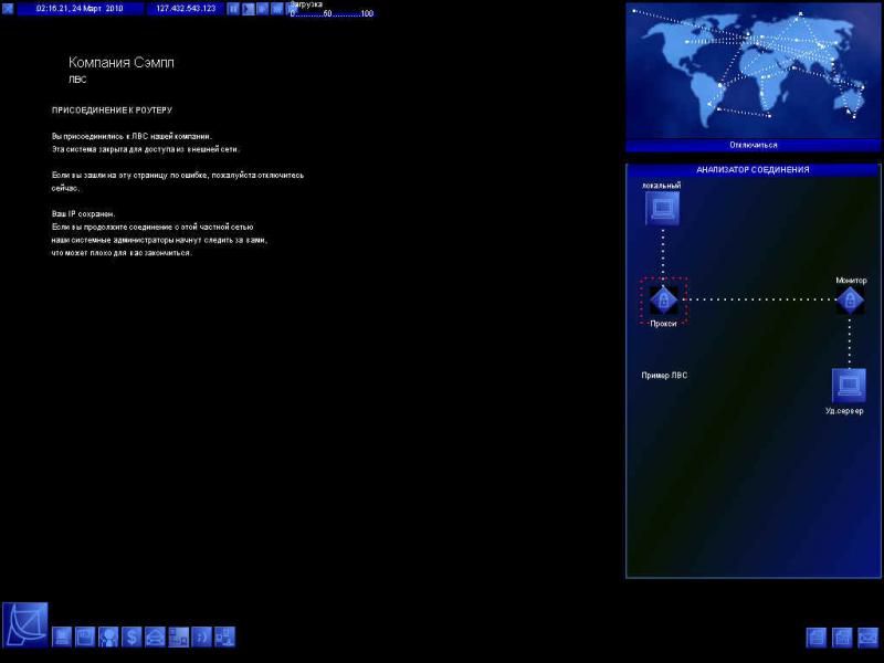 Понятно, что специфика игры не предполагает никаких крутых трехмерных движков; правда, в системных требованиях почему-то фигурирует "видеокарта уровня geforce2". Или разработчики считают, что более простых видеокарт уже ни у кого не осталось? Так или иначе, на скриншотах мы видим различные схемы передачи информации, списки данных, системные сообщения и даже логи чатов.