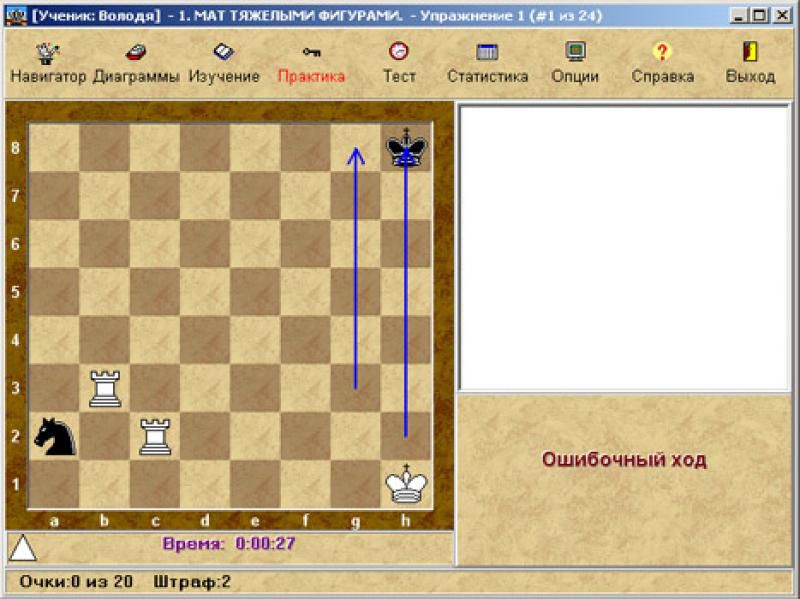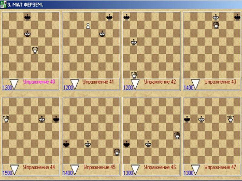 В этом режиме"Шахматная школа" фактически выступает в роли обычной игровой программы. Результаты решения заданий запоминаются, и эта статистика хранится и может сравниваться для нескольких пользователей. Программа автоматически создает тесты для каждого пользователя в зависимости от уровня его игры и с учетом задач, которые решались ранее. По результатам теста оценивается уровень подготовки по заданной теме.