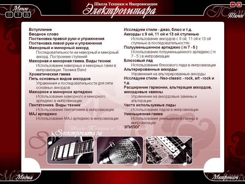 В программе рассказывается о построении и использовании аккордов, постановке рук и видах техник. Приводится информация о различных музыкальных стилях. В «Школе» подробно рассмотрены как теоретические, так и практические аспекты техники и импровизации. Основное внимание в самоучителе уделено развитию импровизационного мышления и технике игры. 296 видеофрагментов наглядно демонстрируют технику исполнения приведенных на диске примеров и упражнений. А закрепить полученные знания на практике помогут 115 тренинг-программ.