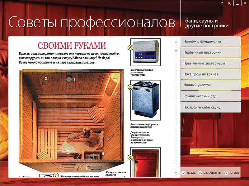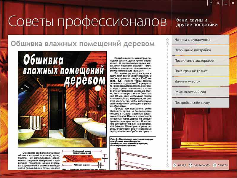 Коротко его содержание можно сформулировать так: «от фундамента до печки» – все, что связано со строительством, обустройством, оснащением и эксплуатацией больших и маленьких бань. Кроме описания конструкций бань, на диске размещено много материалов о сооружении водоемов, хозяйственных, декоративных и других построек, необходимых на дачном участке. Здесь вы найдете ответы на часто задаваемые и «неспецифичные» вопросы. Например, электрозащита и водоснабжение, чем следует руководствоваться при выборе печи-каменки для бани. Подробные сведения о материалах, особенности и маленькие хитрости надворного строительства – для практичных и хозяйственных мужчин. Описания и чертежи представлены в удобном и компактном виде (в формате PDF), который позволяет быстро найти необходимые материалы и просмотреть их на экране монитора в том же виде, в котором они были опубликованы в оригинальном издании.