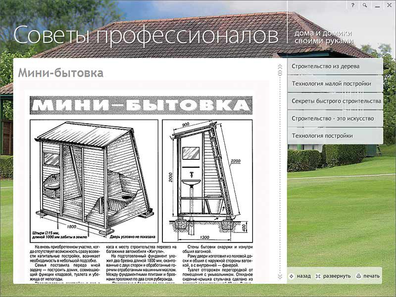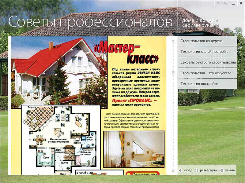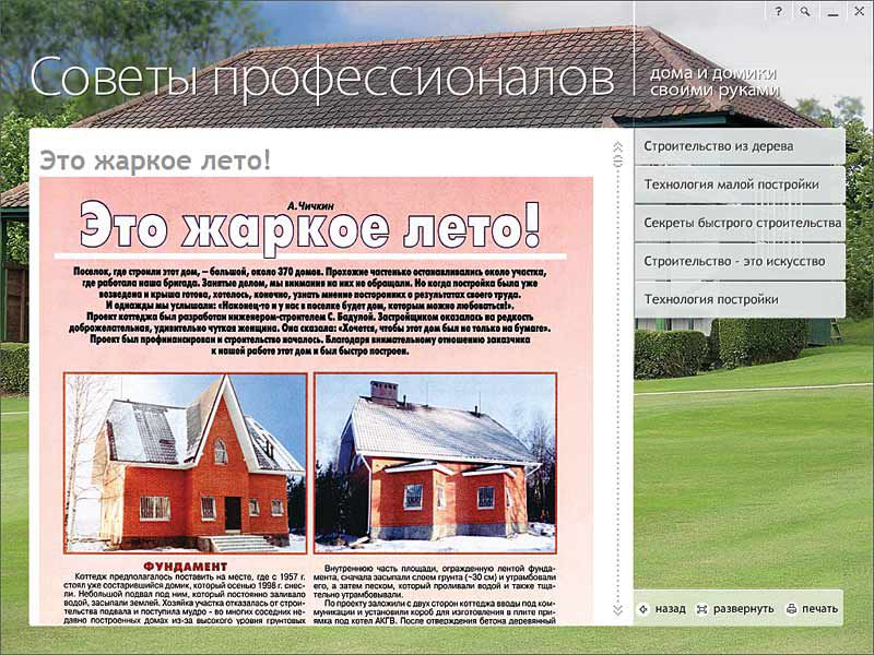 В этом сборнике собрана самая необходимая и полезная информация о самостоятельной постройке кирпичных, блочных и деревянных домов. В основе диска – статьи журнала «Советы профессионалов», где особое внимание традиционно уделено технологии «малой постройки» и рациональному использованию материалов. Здесь описывается технология строительства с первого шага до обустройства готового помещения. Но ведь строительство – это тоже искусство, поэтому на диске приводятся комментарии и советы архитекторов, инженеров, плотников.