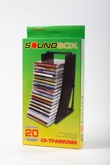 SoundBox СD-20 TR Вертикальная стойка «трамплин» для хранения 20 компакт-дисков. Изготовлена из ударопрочного полистерола. Прочная, сборная конструкция. Наращивается по горизонтали. Цвет: чёрный. Упаковка изделия: Стойка упакована в картонную коробку с красочной, полноцветной печатью, содержащей всю необходимую информацию об изделии на русском языке. Стойка находится в разобранном виде.