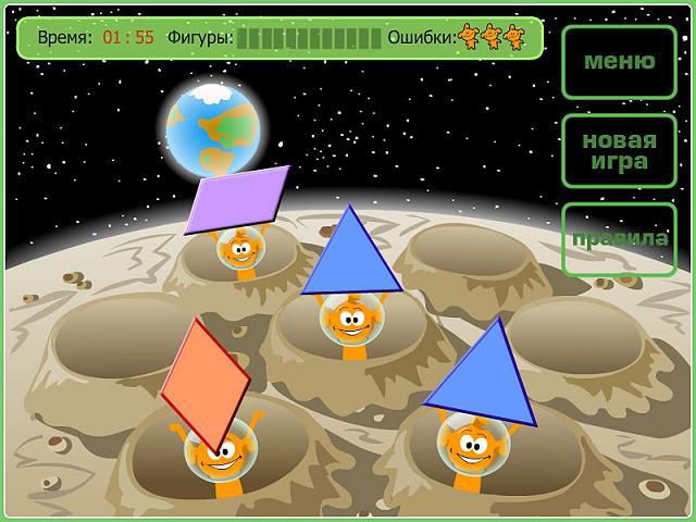 Вместе с забавным анимированным персонажем малыш научится отличать квадрат от куба, круг от шара, треугольник от пирамиды. Размещая маленькие геометрические фигуры внутри больших и строя из них загадочные сооружения, ваш ребенок поймет, как они соотносятся между собой. Но это еще не все! Гоняясь за шустрым зайцем по запутанным дорожкам, он сможет попробовать применить на практике полученные знания. Для каждой игры существует несколько уровней сложности – ребенок сам может подобрать наиболее подходящий для себя.