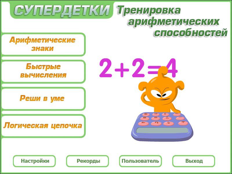 Курс "Супердетки: Тренировка арифметических способностей" содержит набор увлекательных заданий и упражнений на развитие логического мышления и навыков устного счета. Упражнения представлены в виде мини-игр, поэтому не займут много времени, а забавный герой игры сделает занятия веселыми и увлекательными.