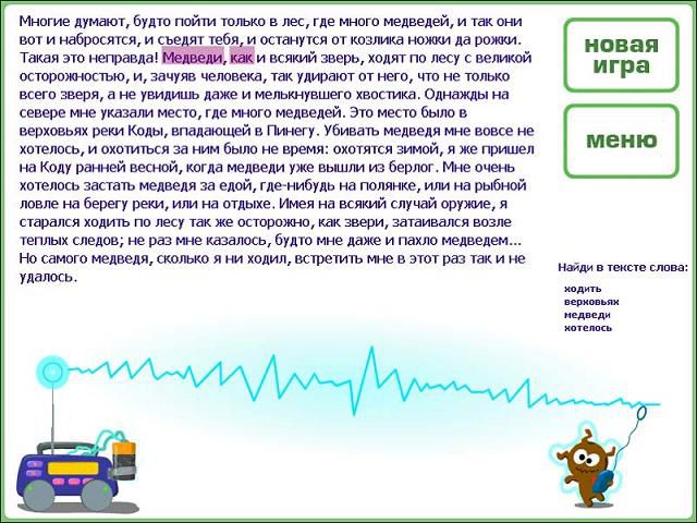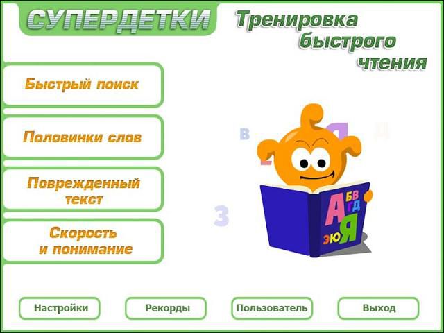 Научите своего ребенка быстро читать благодаря программе Супердетки. Тренировка быстрого чтения. Все родители мечтаютня о том, чтобы их детки росли умными, сообразительными, талантливыми и успешныминя. Теперь это не сложно! Курс «Супердетки: Тренировка быстрого чтения» содержитня набор увлекательных заданий и упражнений, которые помогут вашему ребенку развить навыки чтения. Упражнения представлены в виде мини-игр, что не требует большихня затрат времениня. Веселый персонаж будет сопровождать вашего ребенка во время игры и не даст ему скучать. Для каждой игры существует несколько уровнейня сложности, ребенок сам сможет подобрать наиболее подходящий для себяня. В программе представлены четыре вида заданий: