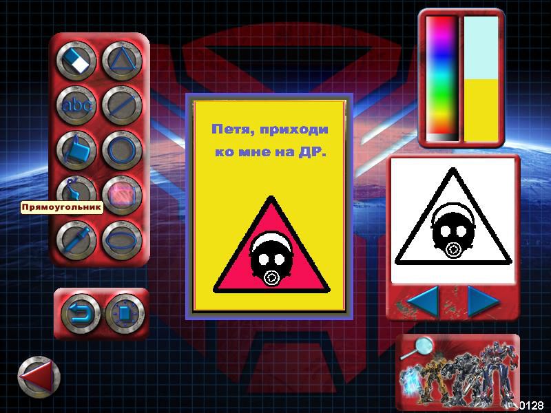 Благодаря этой яркой обучающей игре ребенок сможет воплотить собственную дизайнерскую задумку - нарисовать и раскрасить плакаты, закладки, календарики, открытки и множество других полезных и приятных вещиц с изображением любимых героев - роботов-трансформеров.