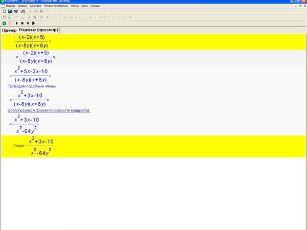 • Решение рациональных уравнений и неравенств, упрощение алгебраических выражений, разложение на множители и упрощение числовых выражений с радикалами, и многое другое