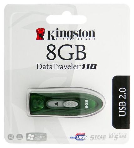 Флэш-диск Kingston DataTraveler 110 - это практичная, надежная, недорогая модель эконом-класса. Флэшка очень компактна ( 54,41 x 21,24 x 13 мм) и почти невесома (12 г). Конструкция USB Flash Drive не имеет колпачка и предусматривает выдвигающийся USB-коннектор. Корпус изготовлен из пластика. Его зеленый цвет обозначает емкость USB-диска на 8 Гб. Устройство поддерживает plug and play и имеет широкую совместимость с компьютерами. Поддерживаемые ОС: Windows Vista (без поддержки ReadyBoost), Windows 2000 (SP4), Windows XP (SP1 и SP2), Mac OS (10.2x +), Linux (2.6 +).