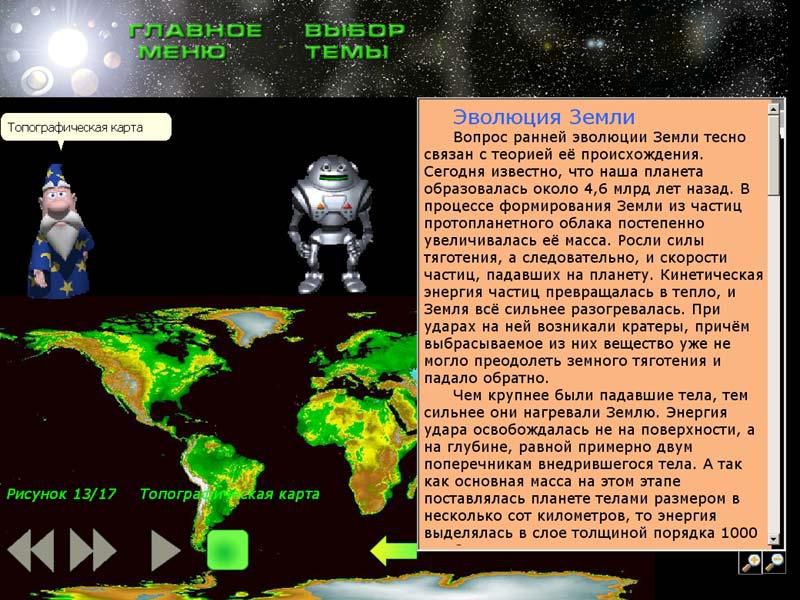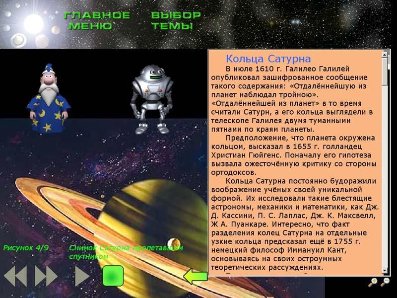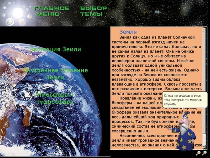 Учебный материал диска содержит познавательные статьи о каждой из планет, ее истории, спутниках, особенностях строения, а также множество красочных иллюстраций и фотографий. Многие фотографии планет были сделаны с помощью современных телескопов, а некоторые из них были получены прямо со спутников.