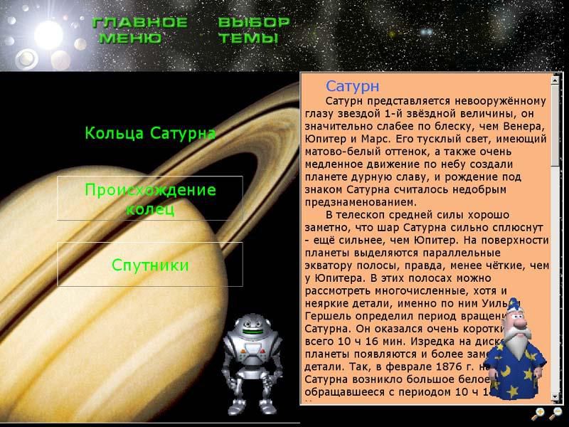 Познавательная программа о планетах Солнечной системы адресована в первую очередь школьникам. В увлекательной форме рассказывается о Солнце, Меркурии, Юпитере, Сатурне, Венере, Марсе, Земле и Луне, Уране, Нептуне, Плутоне, а также о недавно открытой планете Кваваре.