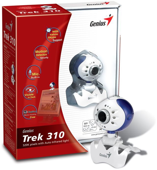 Genius Trek 310 - это веб - камера классического дизайна. Основным отличием является инфракрасная технология, которая позволяет проводить видео чаты в условиях низкой освещенности. Камера с функцией автоматической подсветки пригодится пользователям, любящим засидеться у ПК допоздна. Особая конструкция подставки позволяет крепить камеру к LCD монитору либо к ноутбуку. Genius Trek 310 является полнофункциональной веб - камерой с интерфейсом USB 1.1 и встроенным микрофоном. Trek 310 можно использовать и как камеру скрытого наблюдения, которая будет реагировать на любое движение и отсылать при этом сообщения по электронной почте.