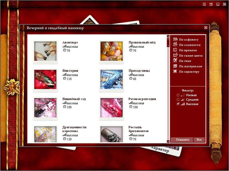 - Удобная группировка произведений нейл-арт по уровню сложности, времени исполнения, цветовой гамме.