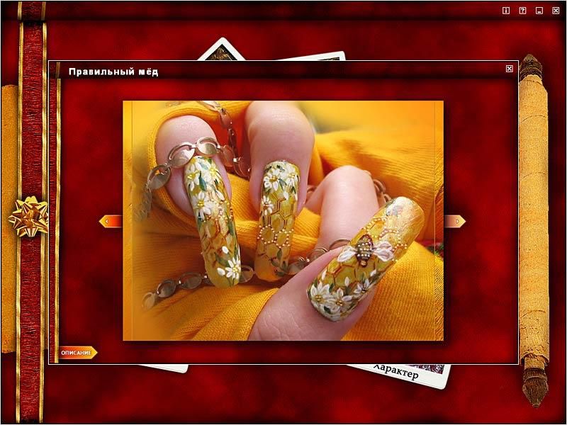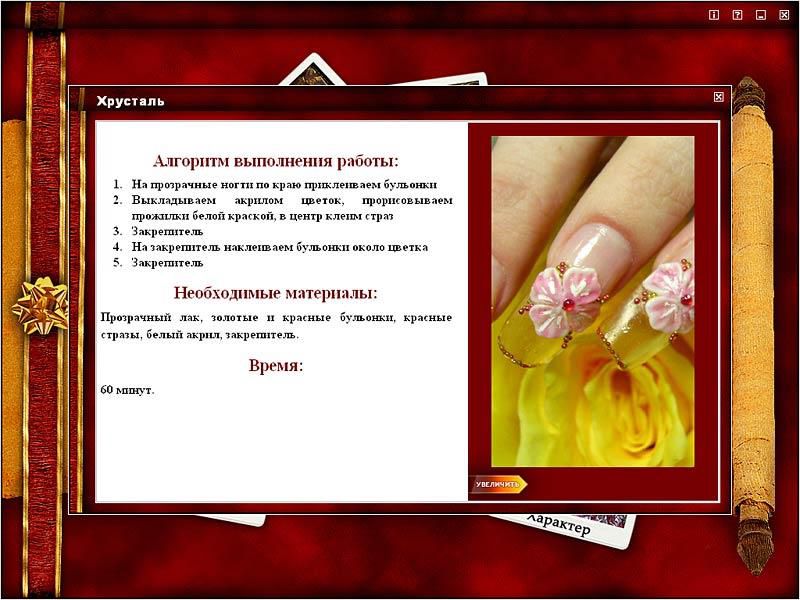 Вы будете выглядеть потрясающе на любом мероприятии! На диске вы найдете более 130 нейл-арт изображений, сгруппированных по темам, уровню сложности, времени на выполнение, цветовой гамме, используемым материалам. Вы можете приступить к работе сразу после запуска программы - подробные инструкции помогут достичь великолепного результата, а список материалов подскажет, что нужно иметь под рукой.