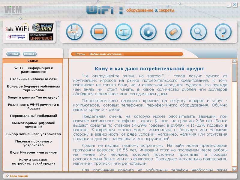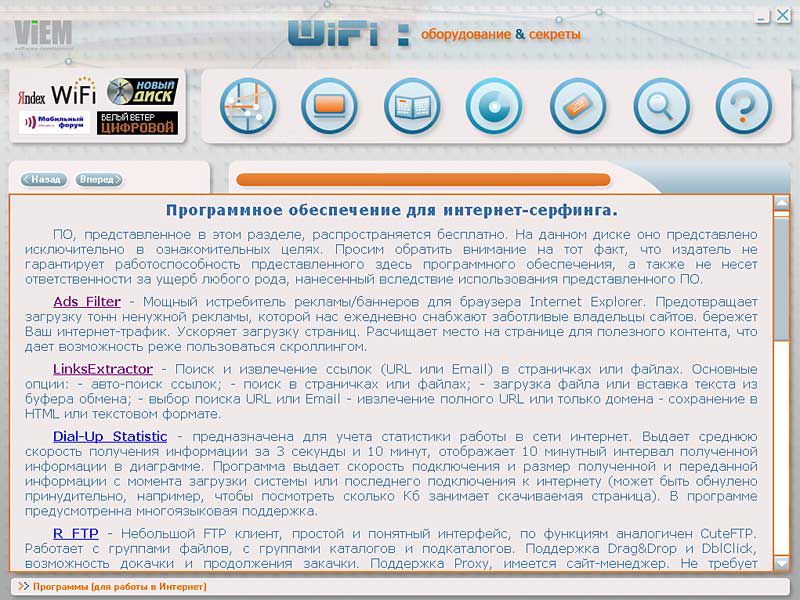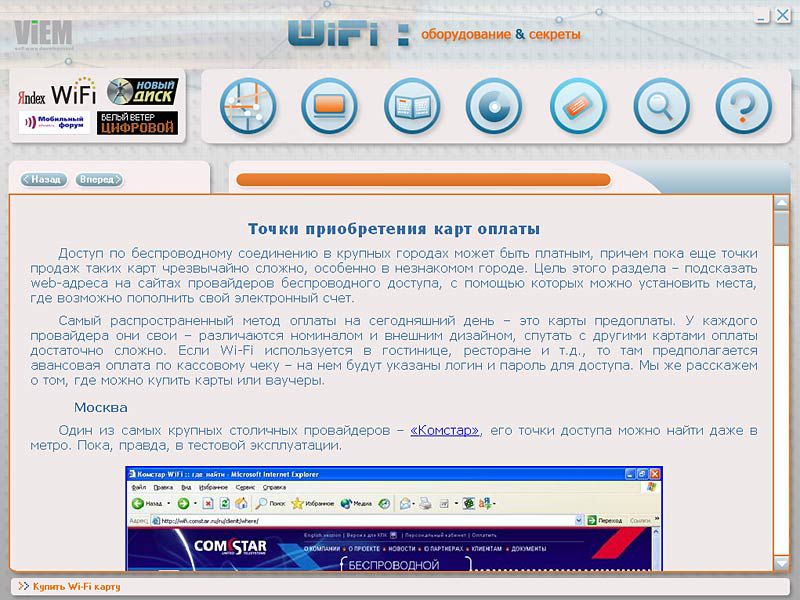 Каждый человек, идущий в ногу с прогрессом, отлично знает, насколько удобно и выгодно иметь доступ к необходимой информации в любом месте и в любое время. В эпоху стремительно совершенствующихся технологий беспроводной доступ в Интернет стал вполне обычным явлением. Если вы хотите больше узнать об этой возможности, познакомьтесь с диском «Выбор и секреты Wi-Fi». Эта электронная энциклопедия содержит обширный каталог беспроводных устройств, поддерживающих Wi-Fi, и информацию о точках подключения в Москве, Санкт-Петербурге, Владивостоке, Киеве и еще 6 крупных городах России и стран СНГ. Уникальная карта, представленная на диске, поможет выбрать наиболее удобное для вас место доступа: от ресторанов и кафе до стоматологических поликлиник и автосервисов! Здесь же вы найдете статьи, посвященные беспроводному Интернету и необходимым устройствам, сможете загрузить полезные программы для интернет-серфинга и многое другое.