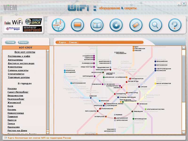 - Основные точки беспроводного доступа в Интернет в столице и еще 9 городах России и стран СНГ, каждая из которых автоматически показывается на карте метро