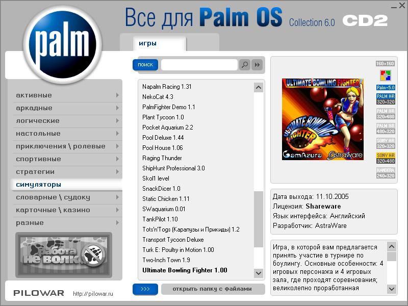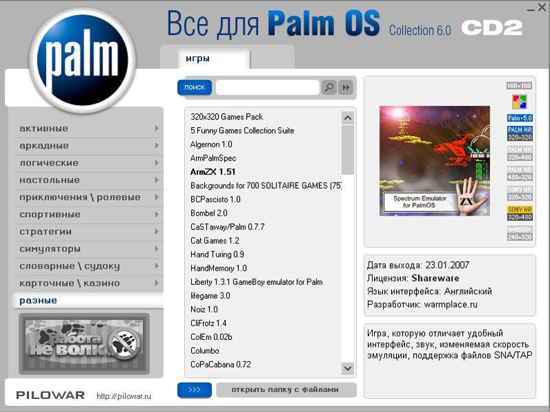 Диск оснащен удобной программной оболочкой, в которой отображаются поддерживаемые версии операционной системы и разрешения экрана для каждого программного продукта, что позволит выбрать совместимое ПО дляPlam. Все приложения снабжены кратким описанием и скриншотом; в оболочке также предусмотрен сквозной поиск по названию приложения во всех категориях.