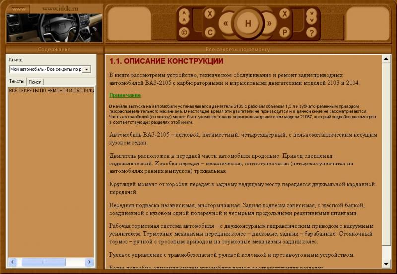 В основных разделах руководства описаны работы по узлам автомобиля ВАЗ-2105. В разделах диска описаны особенности ремонта всех представленных двигателей. Дается описание технического обслуживания и ремонта автомобилей на базе готовых запасных частей, имеются перечни возможных неисправностей и рекомендации по их устранению, а также указания по разборке и сборке, регулировке и ремонту узлов автомобилей.