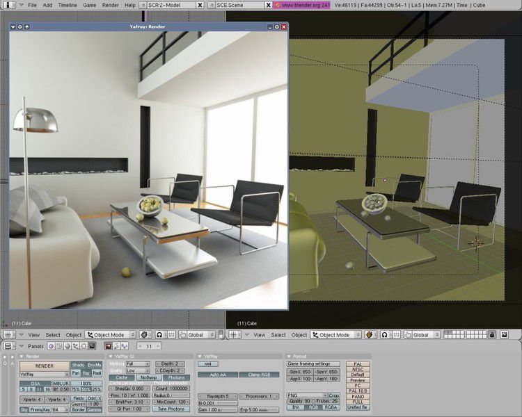 - Универсальные встроенные механизмы рендеринга и интеграция с внешним рендерером YafRay.