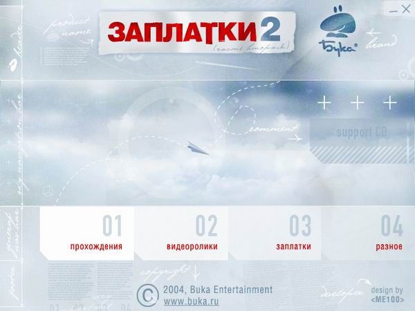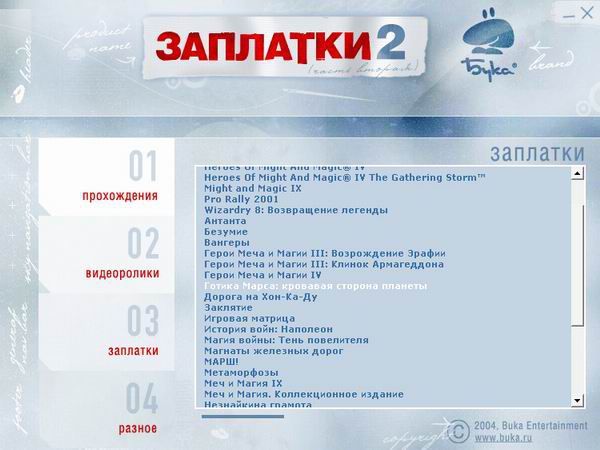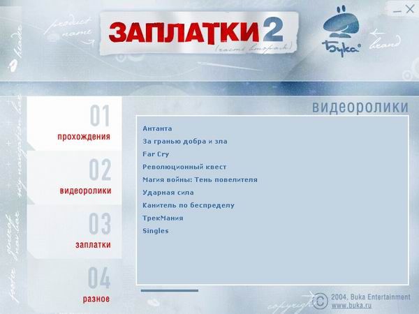 На этом диске вы найдете массу прохождений и самые последние версии патчей для игр, изданных компанией "Бука", видео-ролики, а также драйвера и полезные программы. "Заплатки от Буки 2" — недорого, практично, удобно, надежно. А самое главное, игры будут работать правильно. Сэкономьте время, сберегите деньги — купите "Заплатки"!